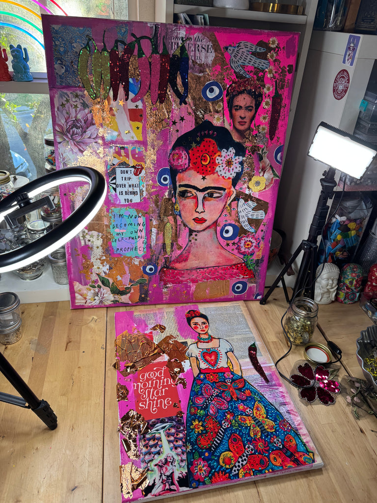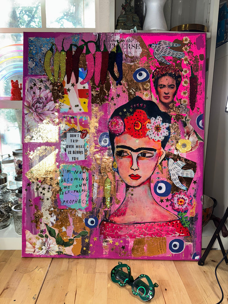 A vibrant mixed-media canvas created in honor of Frida Kahlo, the eternal muse of strength, passion, and transformation.